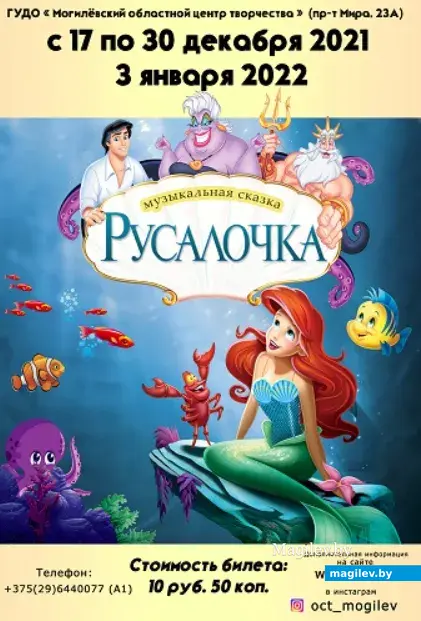 В этом году Областной центр творчества порадует Вас новогодней музыкальной сказкой «РУСАЛОЧКА». В основу музыкального спектакля положен классический сюжет в современном прочтении. Яркие спецэффекты, современная музыка и хореография, завораживающие декорации подводного царства и стилизованные костюмы героев сказки создадут атмосферу настоящего волшебства.