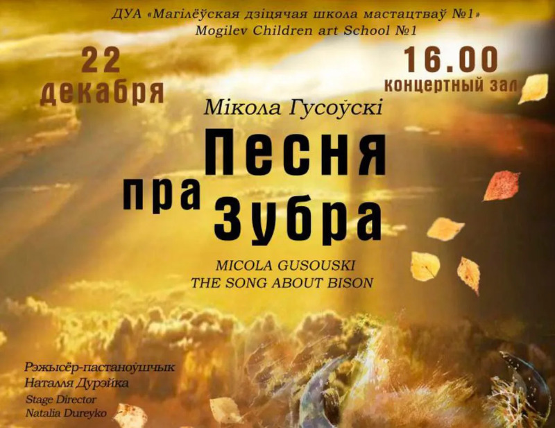 Премьеру спектакля по поэме Николая Гусовского «Песня пра зубра» представит Могилевская детская школа искусств №1 22 декабря. Режиссер постановки – Наталья Дурейко (руководитель образцовой театральной студии «Эхо»). В ее новой работе задействованы юные актеры – учащиеся школы, и взрослые танцоры и музыканты – учителя учебного заведения. Для спектакля написана авторская музыка, поставлены хореографические зарисовки, созданы декорации, использованы современные методы работы световой партитуры.