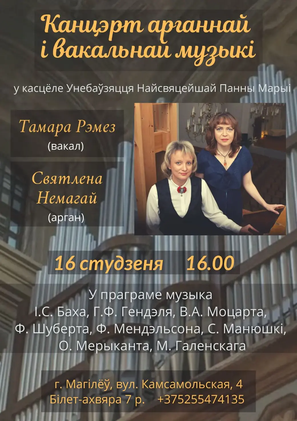 Концерт исполнят Тамара Ремез (вокал) и Святлена Немогай (орган).