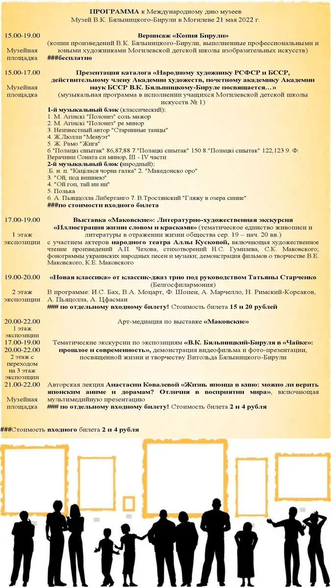 15.00-17.00: Презентация каталога «Народному художнику РСФСР и БССР, действительному члену Академии художеств СССР, почётному академику Академии наук БССР В.К. Бялыницкому-Бируле посвящается…» (музыкальная программа в исполнении учащихся Могилевской детской школы искусств №1). Музейная площадка. Цена – стоимость входного билета в музей.