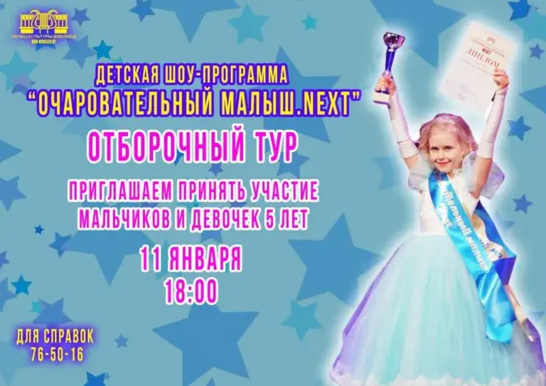 Отборочный этап детской конкурсной шоу-программы пройдет 11 января. Каждому ребенку необходимо представить визитную карточку – рассказать о себе и своих увлечениях в свободной форме - например, через стихи, прозу или песню. Вторым испытанием станет вокальный конкурс, третьим – танцевальный, рассказали во Дворце.