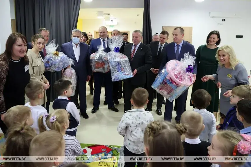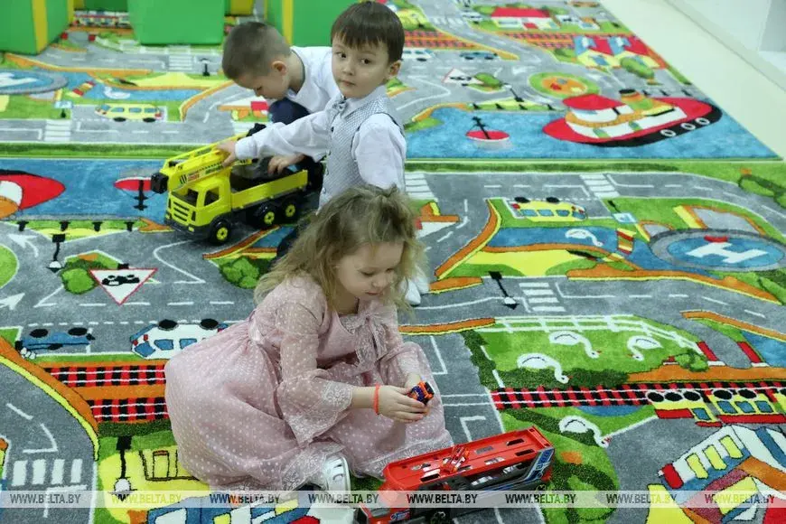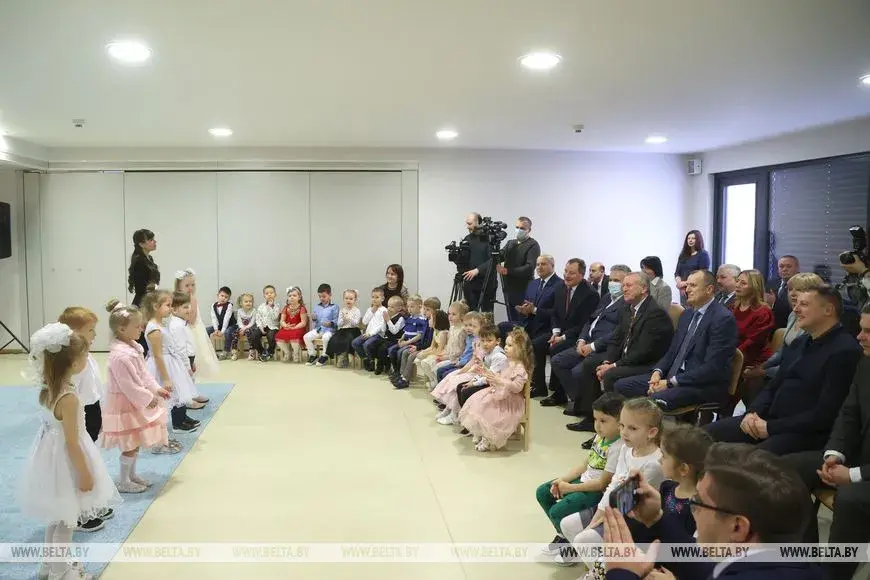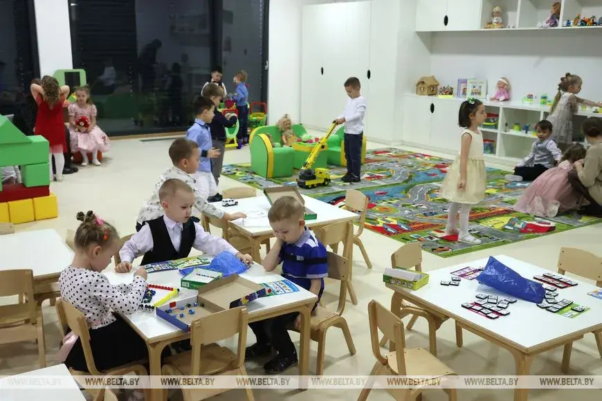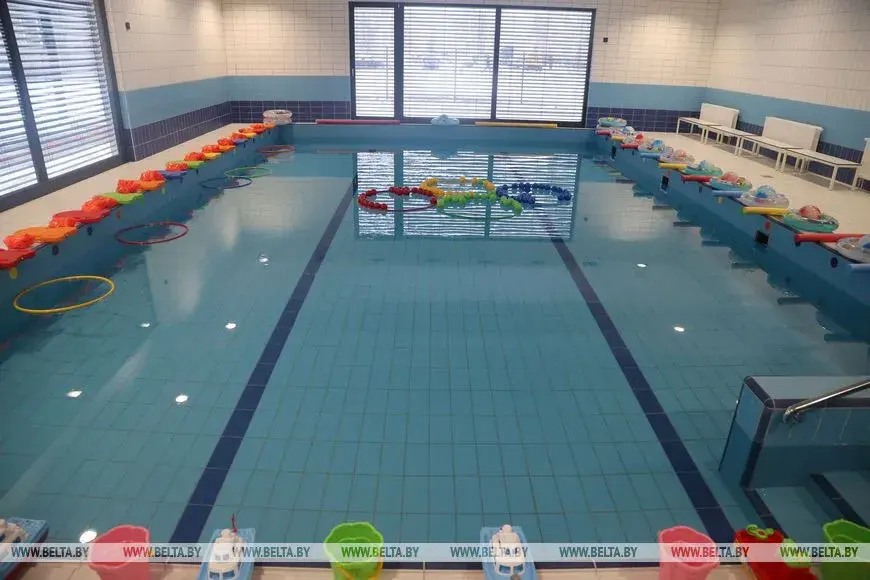 В качестве несущих и ограждающих конструкций одноэтажного здания выбраны деревянные элементы. Здесь располагается крытый бассейн, спортивный и музыкальный залы, игровые зоны для гармоничного физического и интеллектуального развития детей, отдельные групповые крытые террасы, передает БЕЛТА.