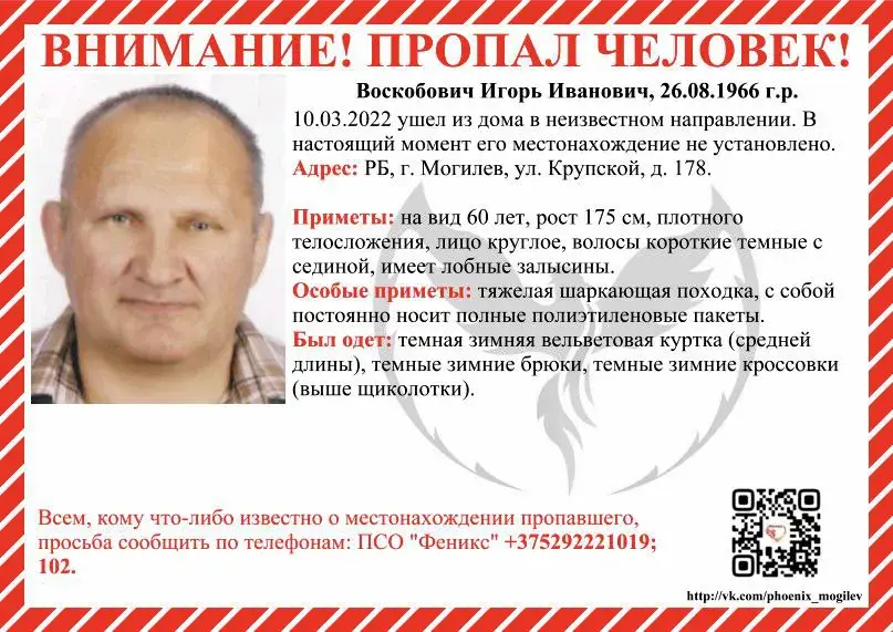 ПСО «Феникс» сообщает приметы пропавшего: на вид 60 лет, рост 175 см, плотного телосложения, лицо круглое, волосы короткие темные с сединой, имеет лобные залысины.
