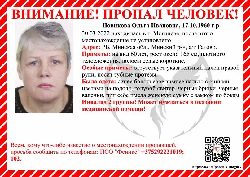 Если вы владеете информацией о пропавшем человеке, сообщите по телефону ПСО «Феникс»: +375 (29) 222-10-19 или милиции: 102.
