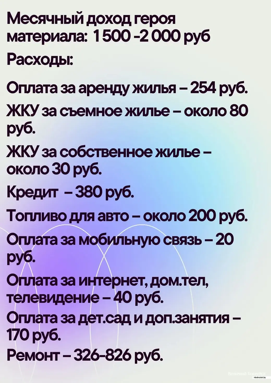 Съемная квартира забирает 100 у.е. в месяц ( по курсу Нацбанка на 14.05 – 253 руб.) плюс коммуналка (в среднем 80 руб). Разъездов по работе много и в разные города – на бензин для машины уходит рублей 200. Часть топлива можно включить в стоимость заказа, но многое все равно на себе. Ремонт машины, как обычно – то несколько месяцев ничего, то за раз 200 руб. можно оставить. За постоянным подорожанием топлива Артем не следит: