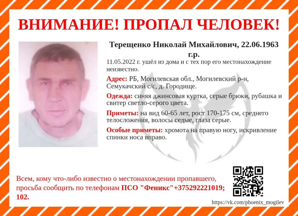 Терещенко Николай Михайлович, 22.06.1963 г.р. 11 мая ушёл из дома по адресу: Могилевская обл., Могилевский р-н, Семукачский с/с, д. Городище. С тех пор его местонахождение неизвестно.