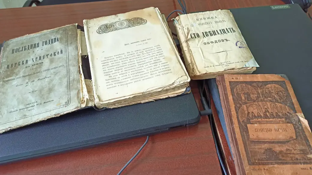 Среди старых изданий, найденных на чердаке, оказались «112 обедов молодой хозяйки» 1889 года, «Последняя година мира и церкви христовой на земле: На основании учения свящ. писания и творения св. отцов (1890 год) и «Соловецкая обитель» (1915 год). Кому принадлежали книги, женщина не знает, но предполагает, что прабабушке и прадедушке.