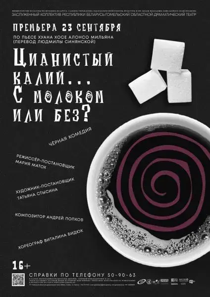 22 июня Гомельский областной драматический театр покажет черную комедию «Ционистый калий ... с молоком или без?» Хуан Хосе Алонсо Мильян (перевод Л.Синянской). Режиссер-постановщик – Мария Матох.