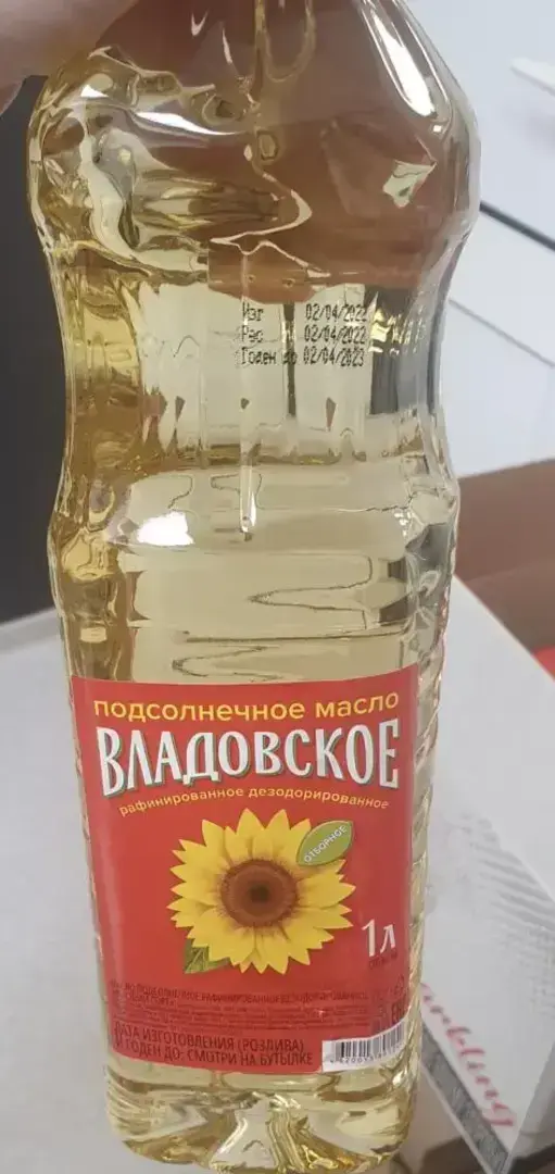 Масло подсолнечное «Владовское» рафинированное дезодорированное высшего сорта, с маркировкой «отборное», упакованное в ПЭТ-бутылку, объем 1 л