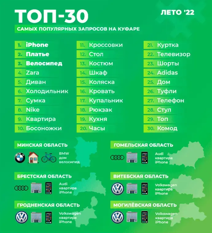 Чаще всего пользователи в летний период искали iPhone, платье и велосипед. Почти половина наиболее популярных запросов на «Куфаре» касалась одежды, обуви и аксессуаров.
