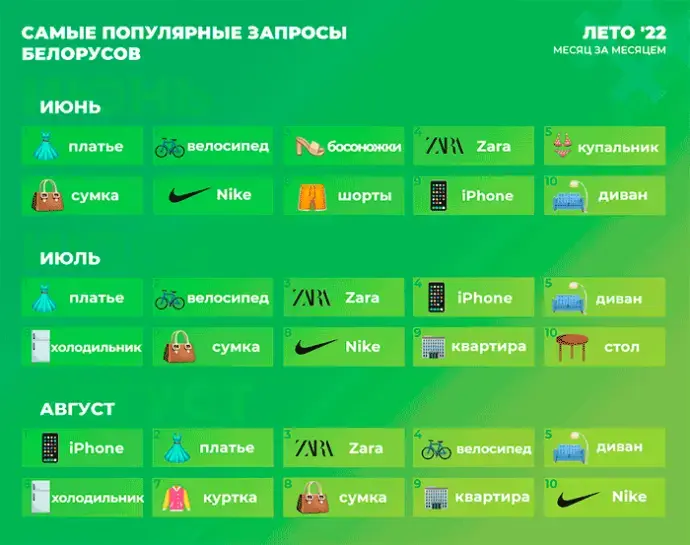 При этом интересы пользователей Куфара заметно менялись от месяца к месяцу. Так, самым «легкомысленным» стал июнь. В первый месяц лета белорусы интересовались товарами, которые нужны в жаркую погоду и на отдыхе – велосипедами, босоножками, купальниками и шортами.