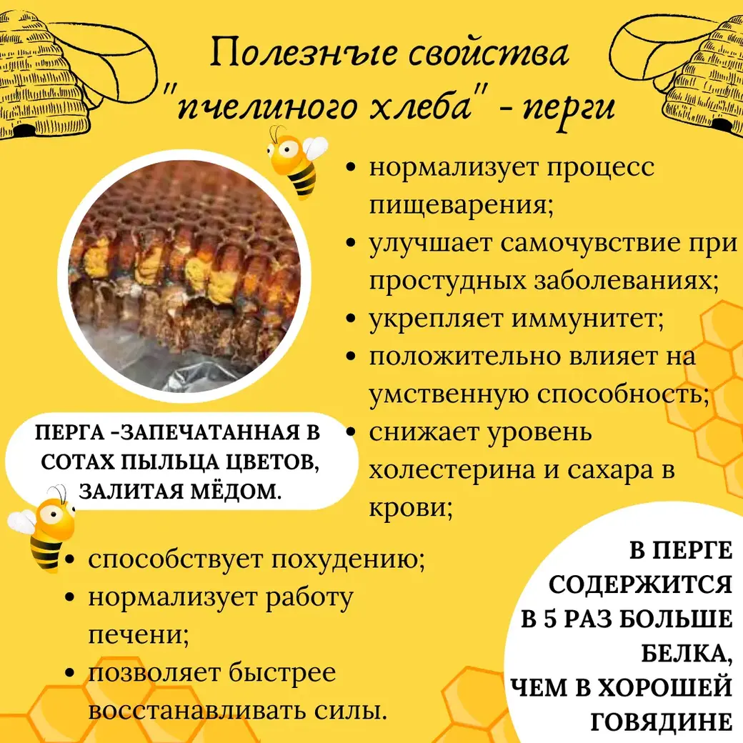 – Фактычна, пярга – гэта закансерваваны ў мёдзе пылок, запячатаны ў сотах, – тлумачыць пчалярка. – У гэтых гранулках утрымліваецца ў пяць разоў больш бялку, чым у ялавічыне, і нават больш, чым у чырвонай рыбе.
