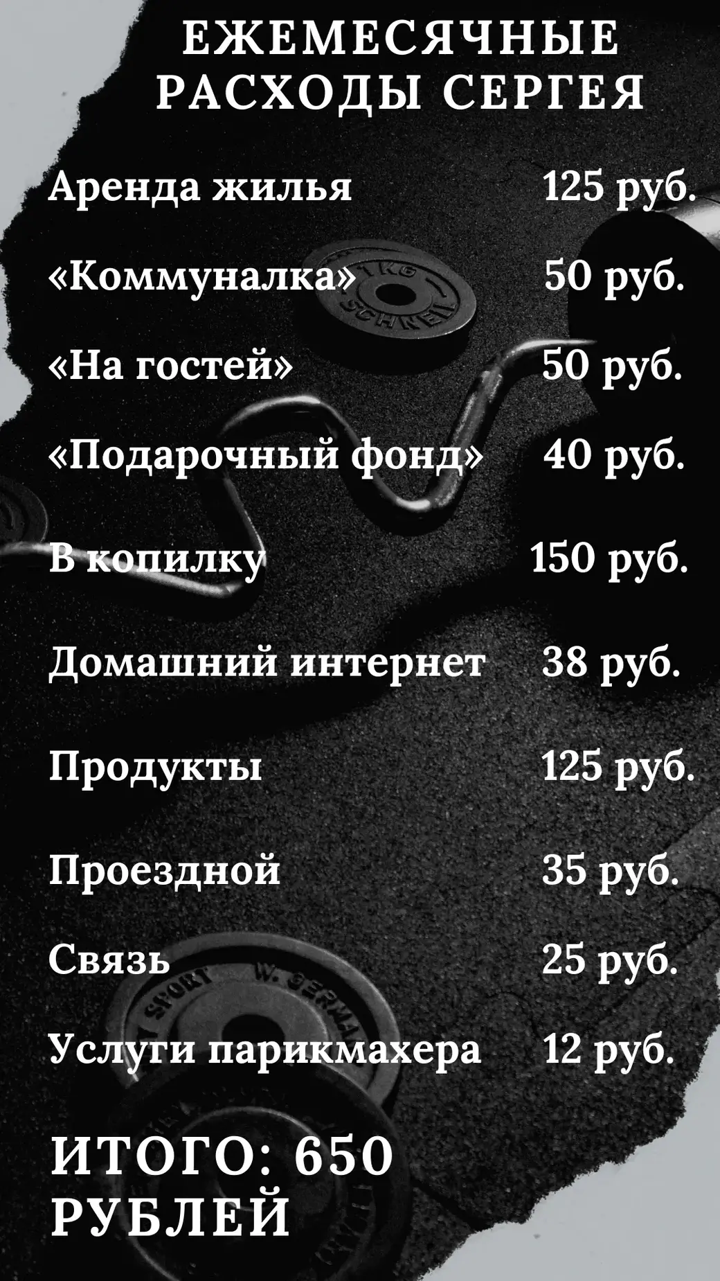 – Я живу совсем рядом с работой, но в спортзал езжу на троллейбусе. 35 рублей отдаю за проездной, – перечисляет Сергей. – За съем квартиры – 125 рублей, а за «коммуналку» 50 рублей, если с отоплением. Мобильная связь – 25 рублей, домашний интернет – 38.