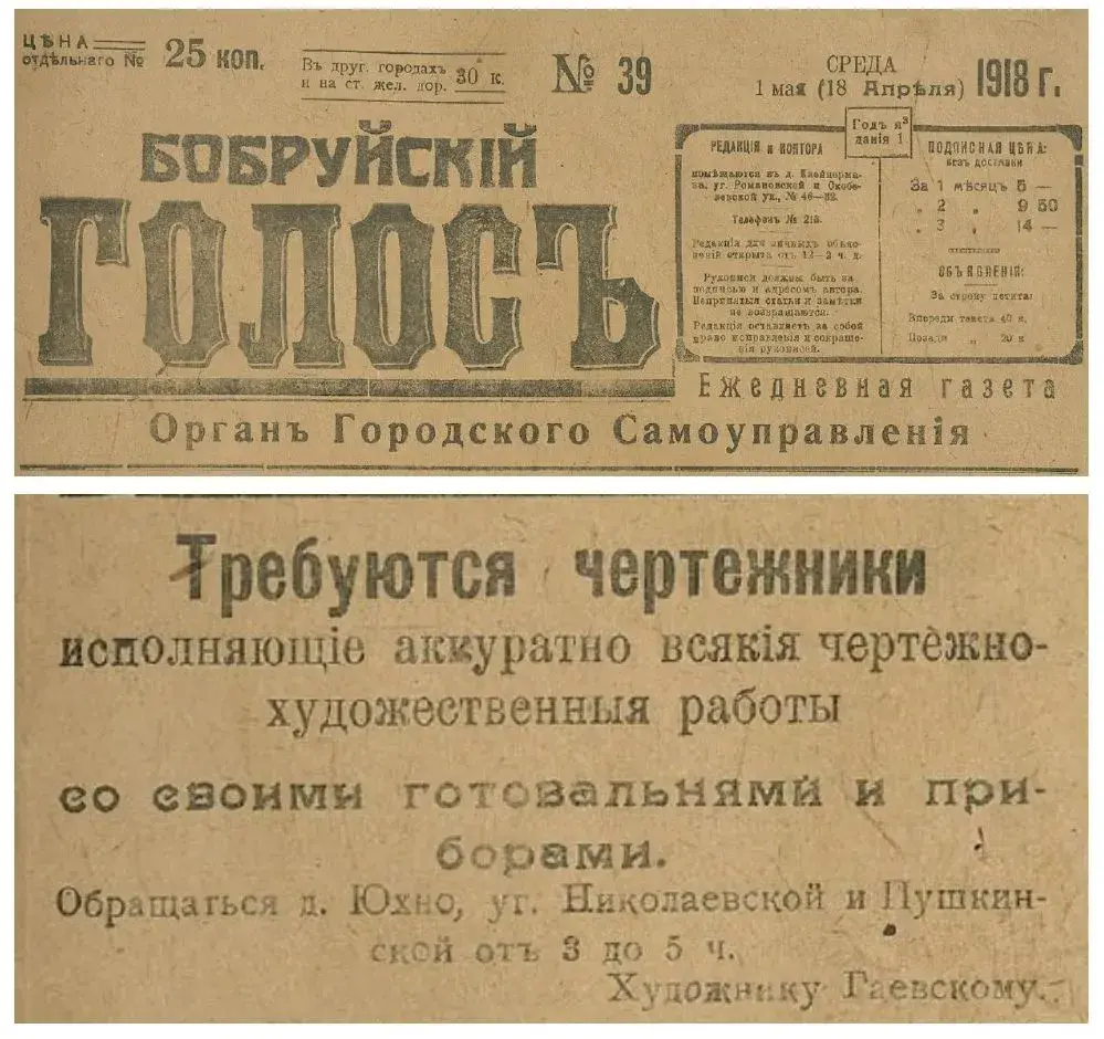 Праглядаючы на сайце Нацыянальнай бібліяткі Беларусі старыя нумары прэсы Беларусі, я звярнуў увагу на аб'яву ў газеце «Бобруйскій голосъ»: «Требуются чертежники исполняющіе аккуратно всякіе чертежно-художественныя работы со своими готовальнями и приборами. Обращаться д. Юхно, уг. Николаевской и Пушкинской. Художнику Гаевскому» (арфаграфія арыгінала).