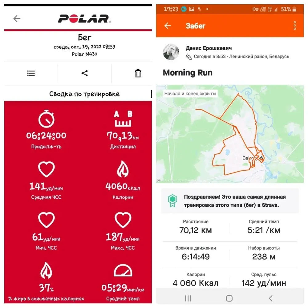 В нашем городе 70-километровую дистанцию преодолел Денис Ерошкевич, сотрудник Бобруйского отдела Департамента охраны. Денис не только пробежал заданный километраж, но и стал единственным из всех участников по стране, кто это сделал за один день, а точнее за 6 часов 24 минуты.