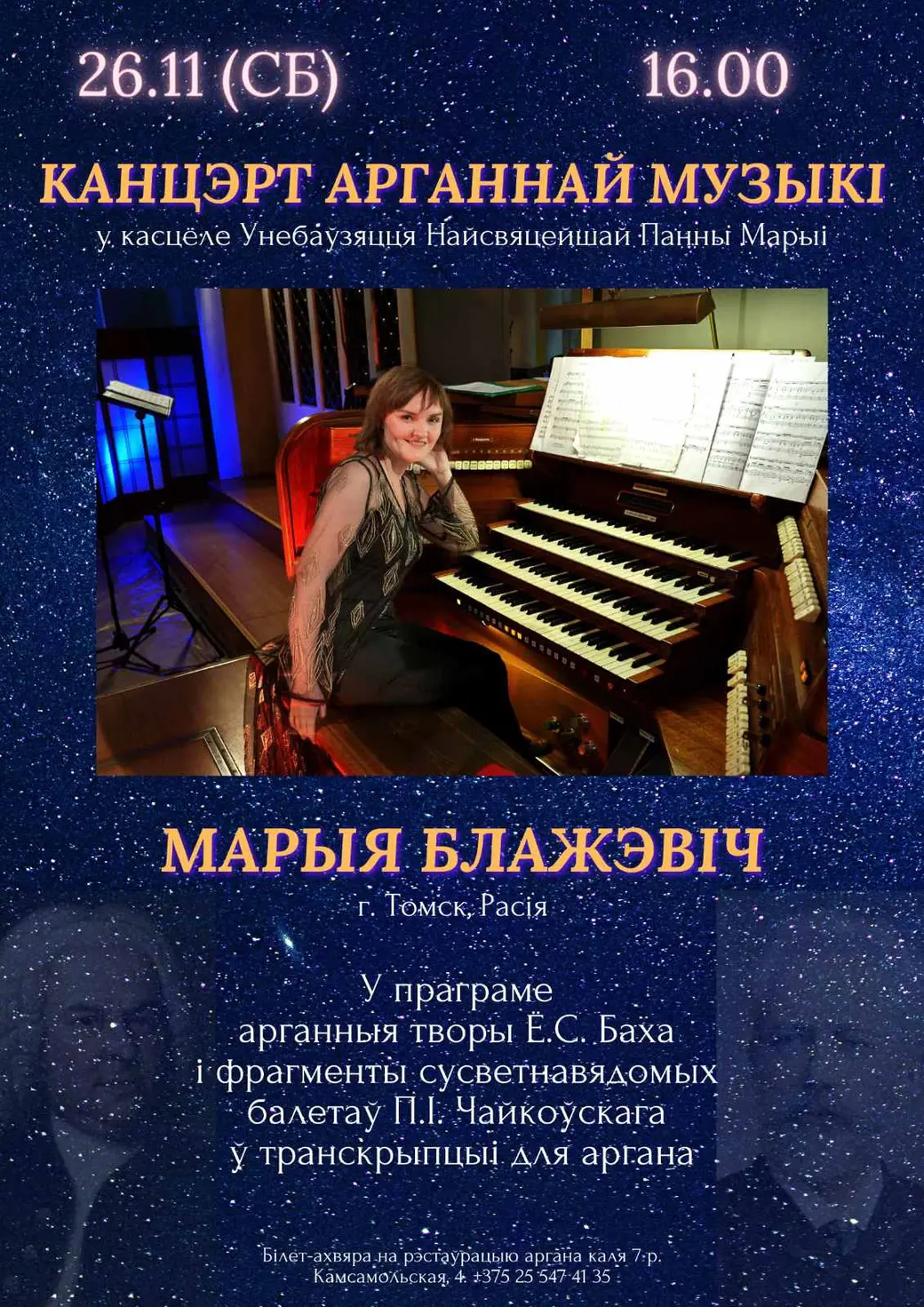 Концерт органной музыки в исполнении томчанки Марии Блажевич будет состоять из музыки мировой классики, в том числе прозвучат органные произведения Иоганна Баха, фрагменты всемирно известных балетов Петра Чайковского в транскрипции для органа.