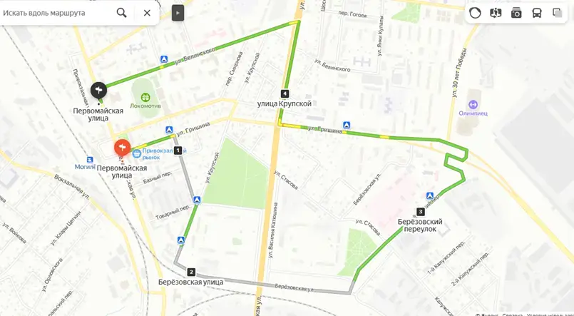 Малая Боровка - ул. Маневича - ул. Тютчева - ул. Киселева - пер. Киселева - Чаусское шоссе (а/д Р122) - пр-т Витебский - пр-т Димитрова- пр-т Пушкинский - ул. Комсомольская - ул. Первомайская - ул. Гришина - пер. Владимирова - ул. Крупской - ул. Березовская - пер. Березовский - ул. Гришина- ул. Крупской - ул. Белинского - ул. Первомайская - ул. Комсомольская - пр-т Пушкинский - пр-т Димитрова - пр-т Витебский - Чаусское шоссе (а/д Р122) - пер. Киселева - ул. Киселева-ул. Тютчева - ул. Маневича - Малая Боровка.
