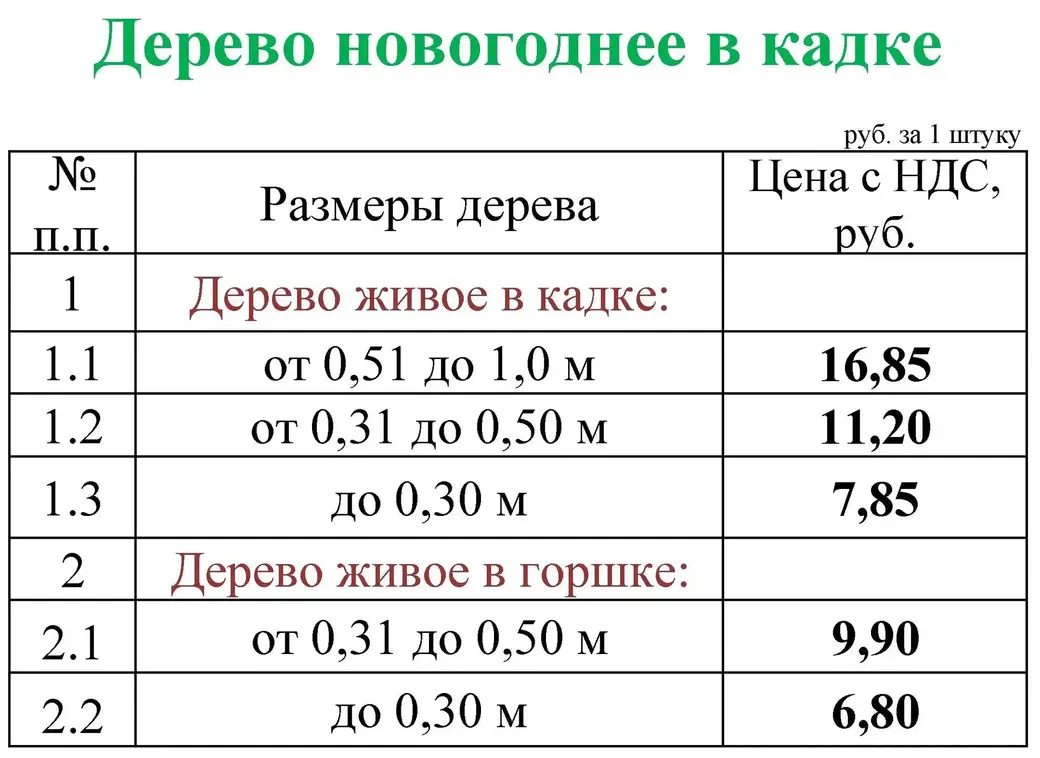 «В этом году стоимость новогодних деревьев остается на уровне прошлого года. В лесхозах дерево до метра будет стоить от 8 рублей, от 1 м и выше – от 10 рублей. На елочных базарах цены будут незначительно выше, а также стоимость новогодних деревьев в регионах может отличаться», - сказал Александр Овсей, главный специалист управления лесного хозяйства Минлесхоза.