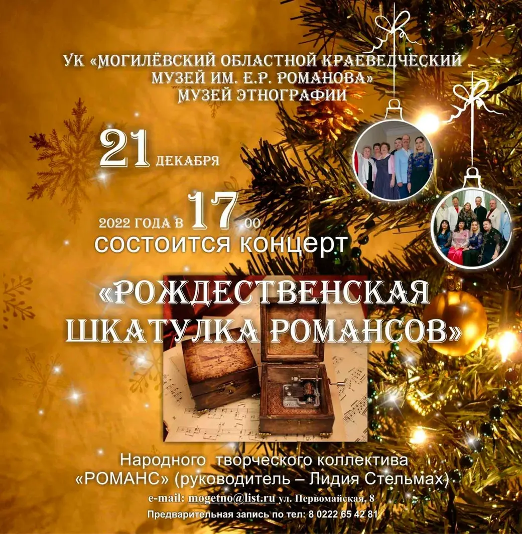Новая программа коллектива «Рождественская шкатулка романсов» – хорошо известные и редко исполняемые романсы, история их создания, живое исполнение под живой аккомпанемент.