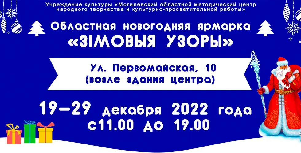 По 29 декабря 2022 года Могилевский областной методический центр народного творчества и культурно-просветительной работы организует новогоднюю ярмарку «Зімовыя ўзоры». На ней можно будет приобрести для всей семьи новогоднюю уникальную, эксклюзивную, авторскую сувенирную продукцию мастеров декоративно-прикладного творчества Могилевской области.
