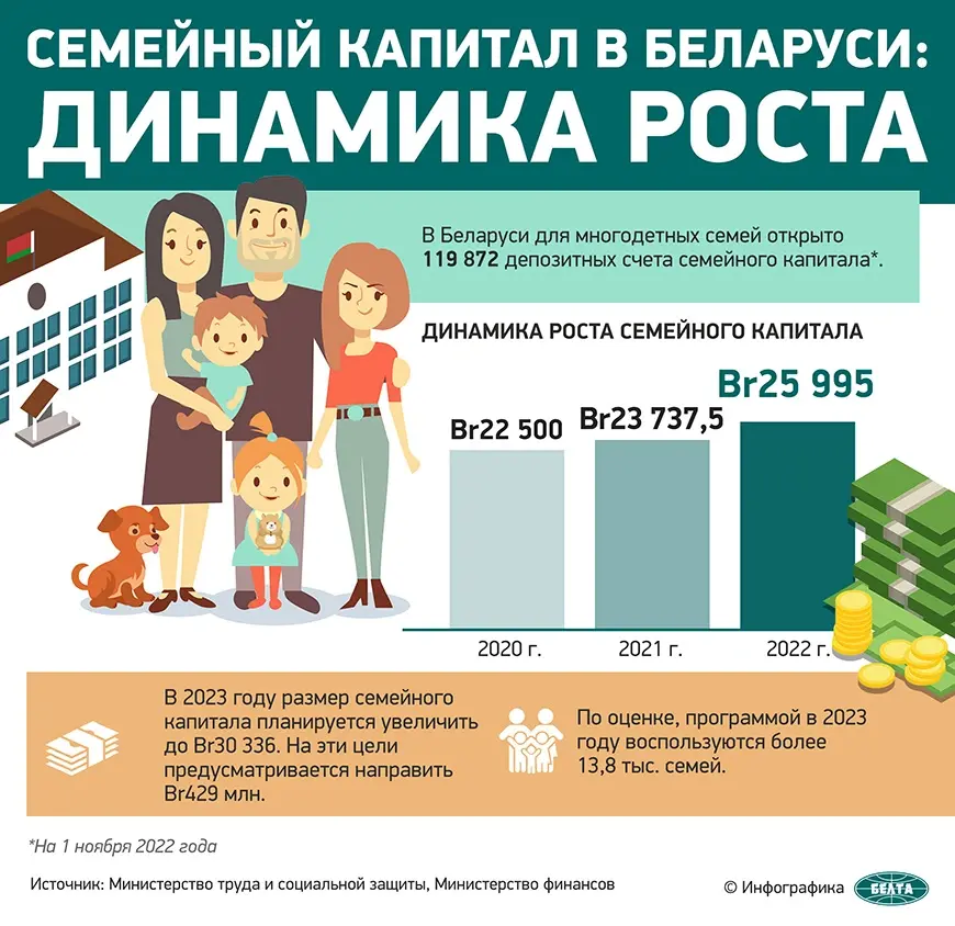 Семейный капитал в Беларуси ввели с 1 января 2015 года. При рождении третьего и последующих детей семья получала 10 000 на депозит, и после его 18-летия средства можно направить на улучшение жилищных условий, получение образования, услуг в сфере здравоохранения и социального обслуживания, формирования накопительной пенсии матери в полной семье, родителя в неполной семье.