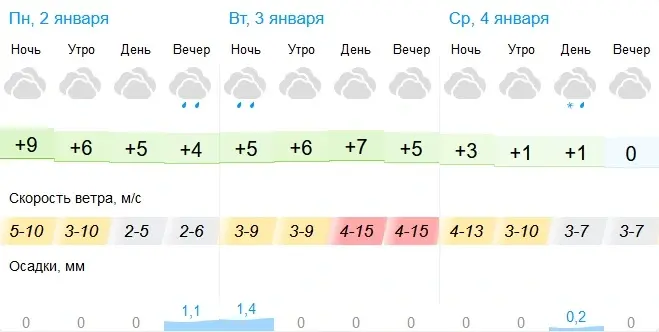 2 января в Беларуси будет облачно с прояснениями. На большей части территории дожди. В отдельных районах слабый туман, на дорогах гололедица. Ветер юго-западный, южный умеренный. Максимальная температура воздуха +3..+9°С, по юго-западу +10..+12°С.