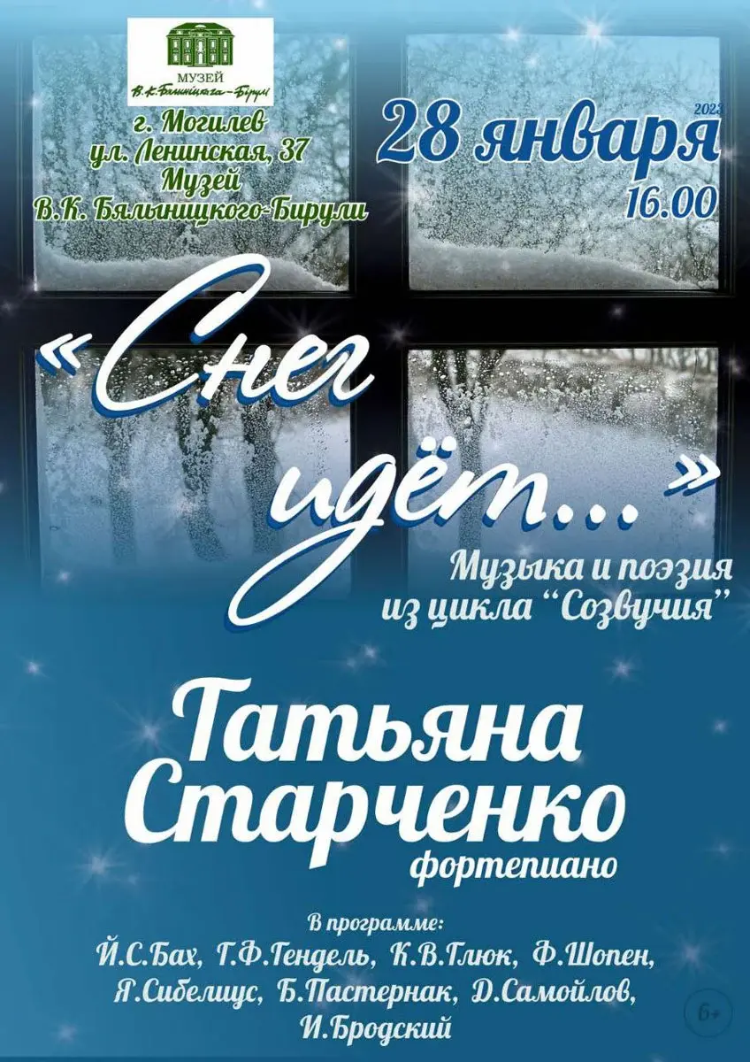 В Могилеве в программе «Снег идет…» прозвучит музыка Иоганна Баха, Георга Генделя, Кристофа Глюка, Фредерика Шопена, Яна Сибелиуса, и поэзия Бориса Пастернака, Давида Самойлова и Иосифа Бродского.