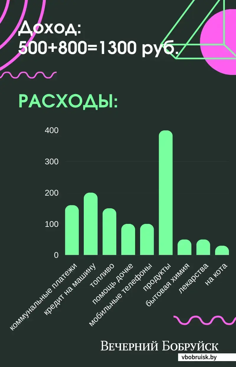 – Вот и получается, что доход – 1300 руб., расход – около 1200 руб. Оставшейся суммы хватает только на мини-покупки: такие как молоко, хлеб. Отложить? Было бы из чего!