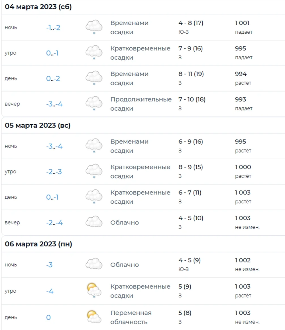 В субботу будет облачно с прояснениями. На большей части территории ожидаются осадки (снег, мокрый снег, днем по югу - с дождем). Днем местами метель. На отдельных участках дорог гололедица. Ветер юго-западный, западный 5-10 м/с, ночью порывы усилятся до 14 м/с, утром и днем - до 15-20 м/с. Температура воздуха ночью составит минус 5 - плюс 1 градус, а днем - минус 1 - плюс 5 градусов.