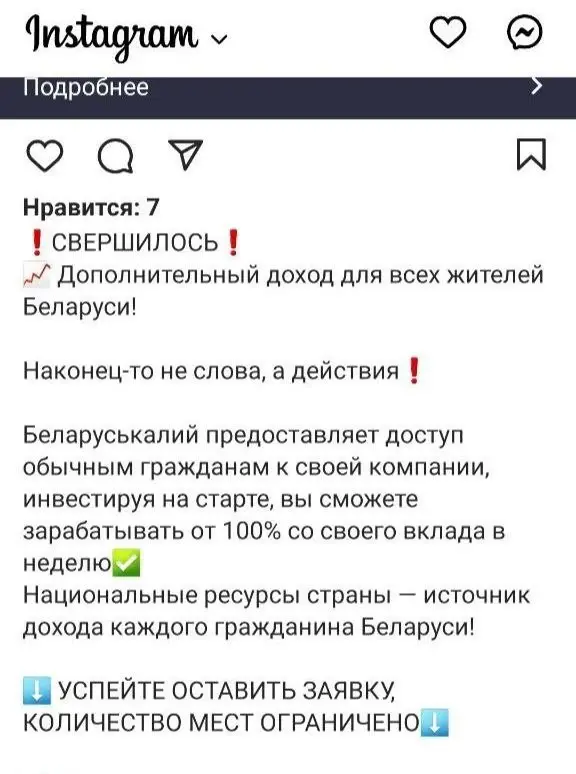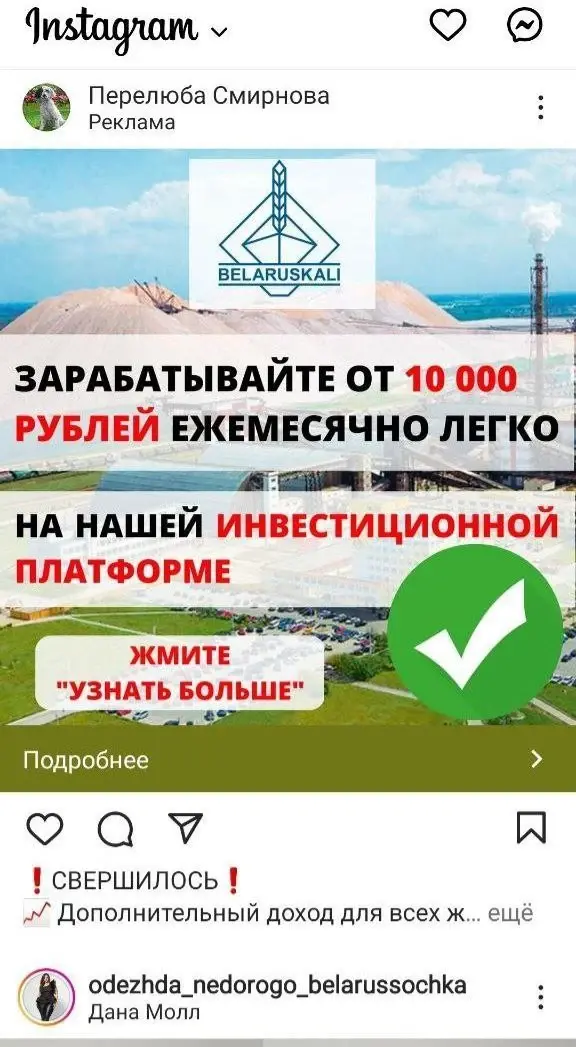 «Беларуськалий» не проводит и не планирует организацию каких-либо программ инвестирования и других финансовых мероприятий с использованием социальных сетей.