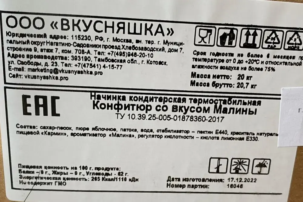 Запрещен ввоз и обращение начинки кондитерской «Конфитюр со вкусом малины».