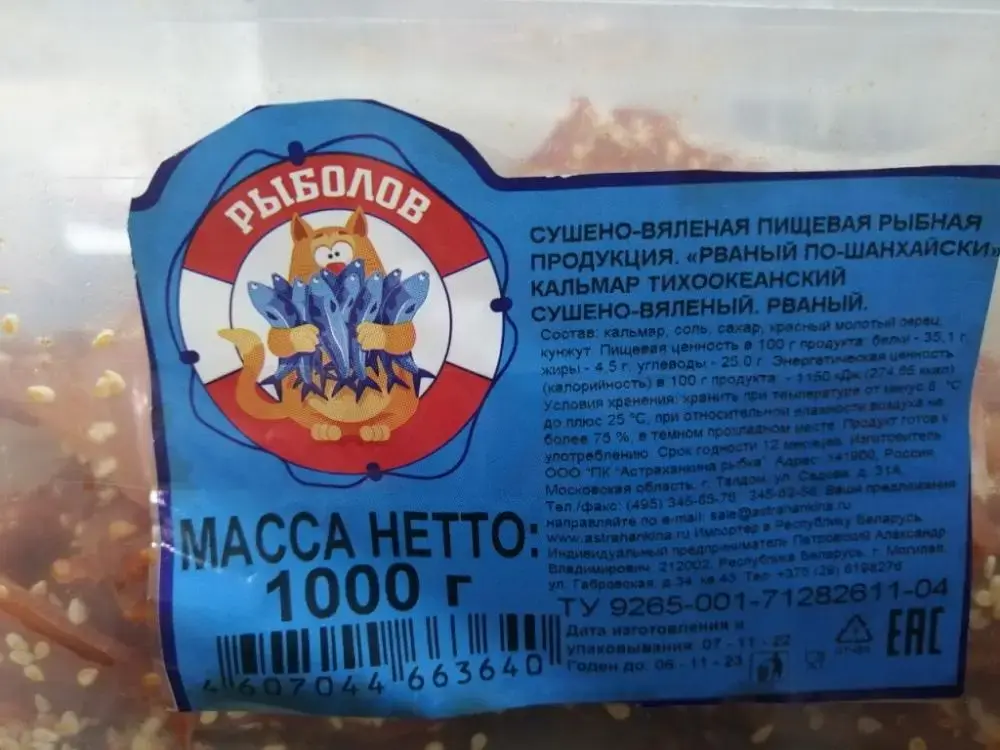 По сообщению ТК сайта Госстандарта, запрещены к реализации в Беларуси кальмар тихоокеанский сушено-вяленый.