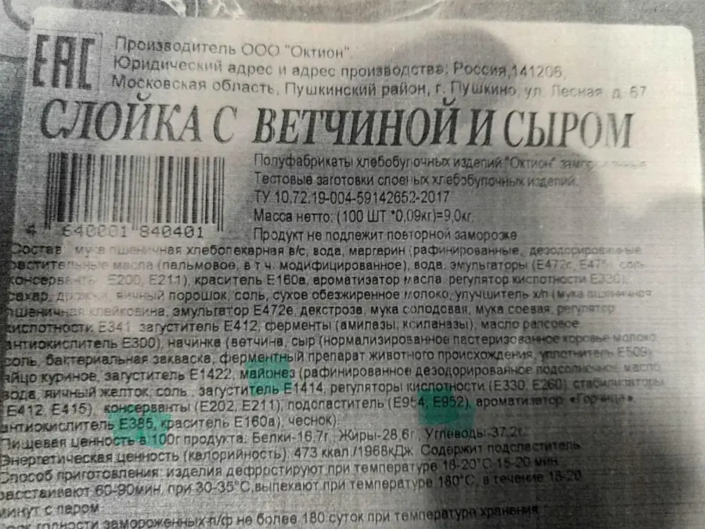 Производитель – ООО «Октион» (Российская Федерация, Московская обл., г. Пушкино). Причина – в состав майонеза, использованного при производстве слойки с ветчиной и сыром, входят заявленные в маркировке пищевые добавки: подсластитель Е952, антиокислитель Е385, недопустимые при производстве майонезов.