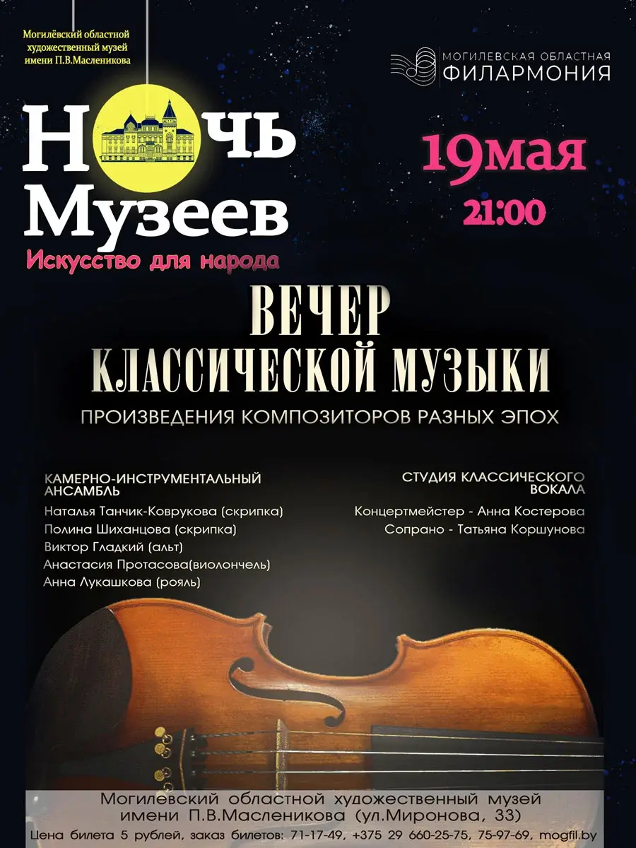 Почти ночной концерт классической музыки состоится в музее Павла Масленикова Могилева 19 мая