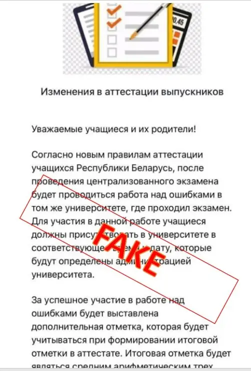 «В социальных сетях распространяется информация о проведении работы над ошибками после ЦЭ. Это фейк. Проведения работы над ошибками не предусмотрено», – говорится в сообщении.