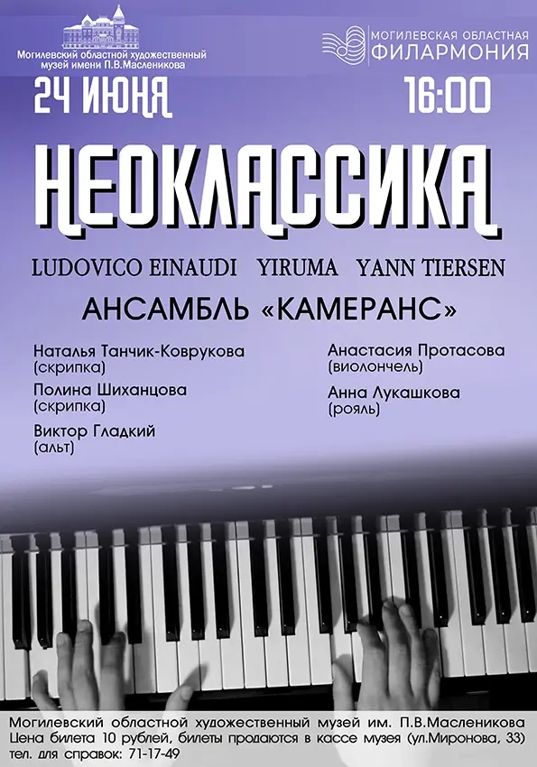Начало концерта 16.00. Цена билета 10 рублей. Билеты продаются в кассе музея с 11.00 до 18.30. Телефон для справок: 80222-71-17-49.