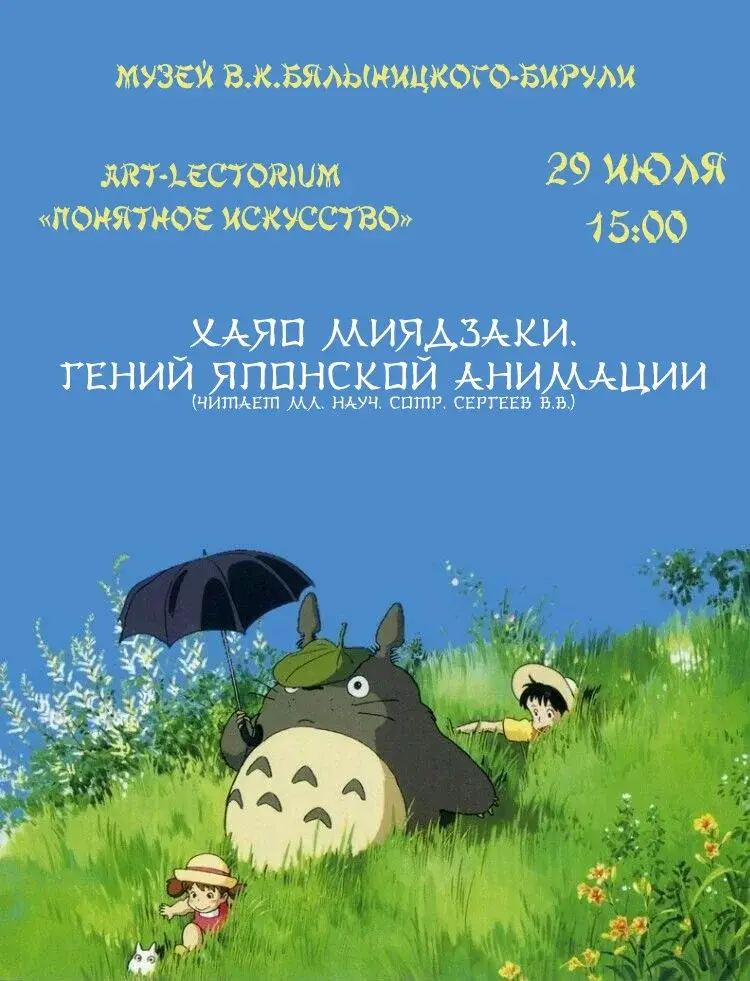 В Японии создание мультфильмов – это искусство, которое принципиально отличается от подобного, например, в Европе и США. Затрагивая тему аниме, у многих с ним уже знакомых возникает ассоциация именно с творчеством Хаяо Миядзаки, На лекции в музее Бялыницкого-Бирули 29 июля расскажут о нем и познакомят с его творчеством.