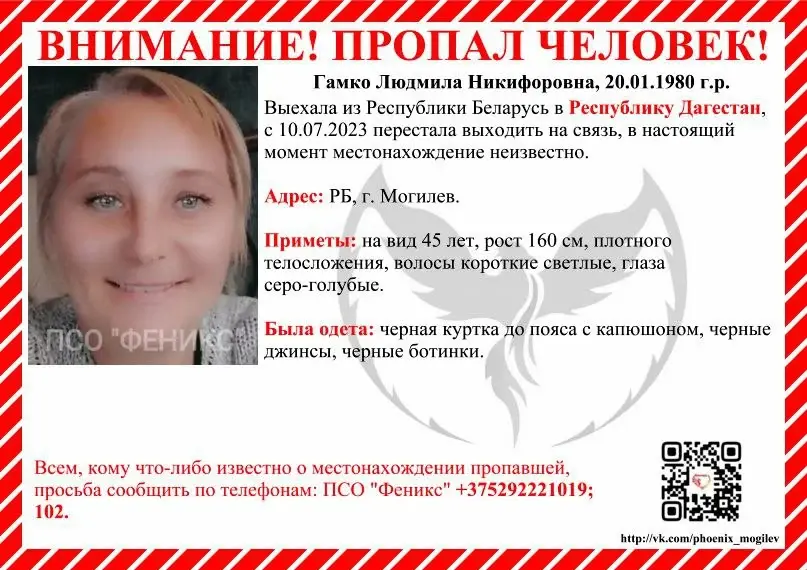 Женщина выехала из Республики Беларусь в Республику Дагестан, с 10 июля перестала выходить на связь, в настоящий момент местонахождение неизвестно.