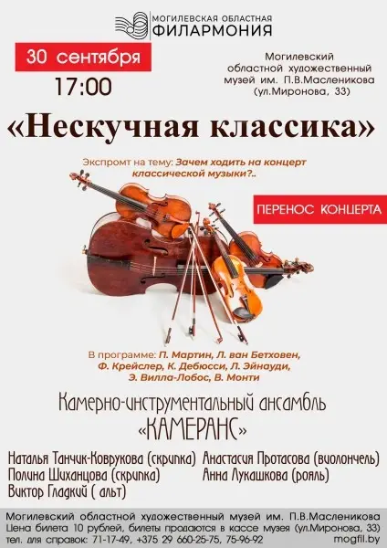 В Могилевской областной филармонии сообщили, что запланированная программа концерта будет неизменной, но представят ее музыканты 30 сентября. Место встречи прежнее – Могилевский областной художественный музей имени Павла Масленикова. Время тоже – 17.00. И цена билета – 10 рублей.