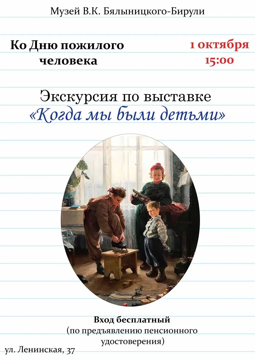 Бесплатная экскурсия для пенсионеров состоится в музее Бялыницкого-Бирули 1 октября – по временной экспозиции «Когда мы были детьми». В ней представлено свыше 70 произведений графики, живописи, скульптуры, декоративно-прикладного искусства, фотографии мастеров XX-XXI веков – коллекция привезена из Минска: фонды Национального художественного музея.