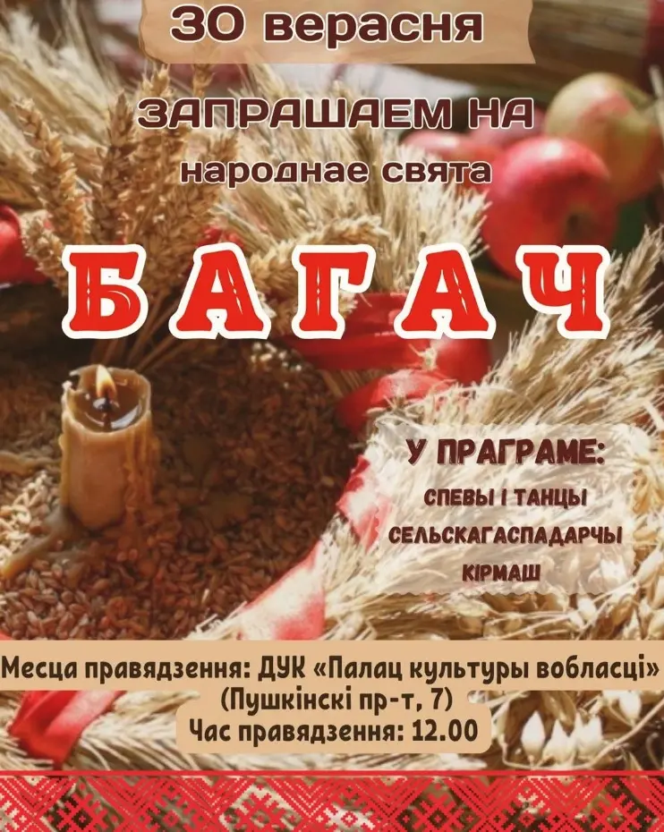 Народный праздник урожая «Багач» пройдет в Могилеве в субботу, 30 сентября. Местом его проведения станет площадка у ДК области (пр-т Пушкинский, 7).