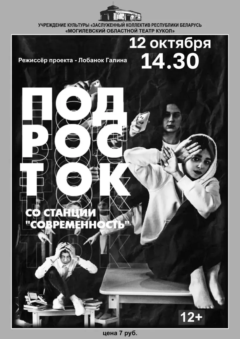 Спектакль «Подросток со станции «Современность» пройдет на сцене Могилевского областного театра кукол 12 октября. Начало в 14.30. Цена билета – 7 рублей. Справки по телефонам: 32-26-90, 74-10-60. Касса: 32-26-47.