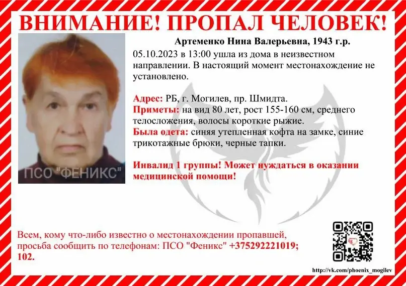 По информации волонтеров ПСО «Феникс», пожилая женщина 5 октября ушла из дома в неизвестном направлении. В настоящий момент ее местонахождения не установлено.