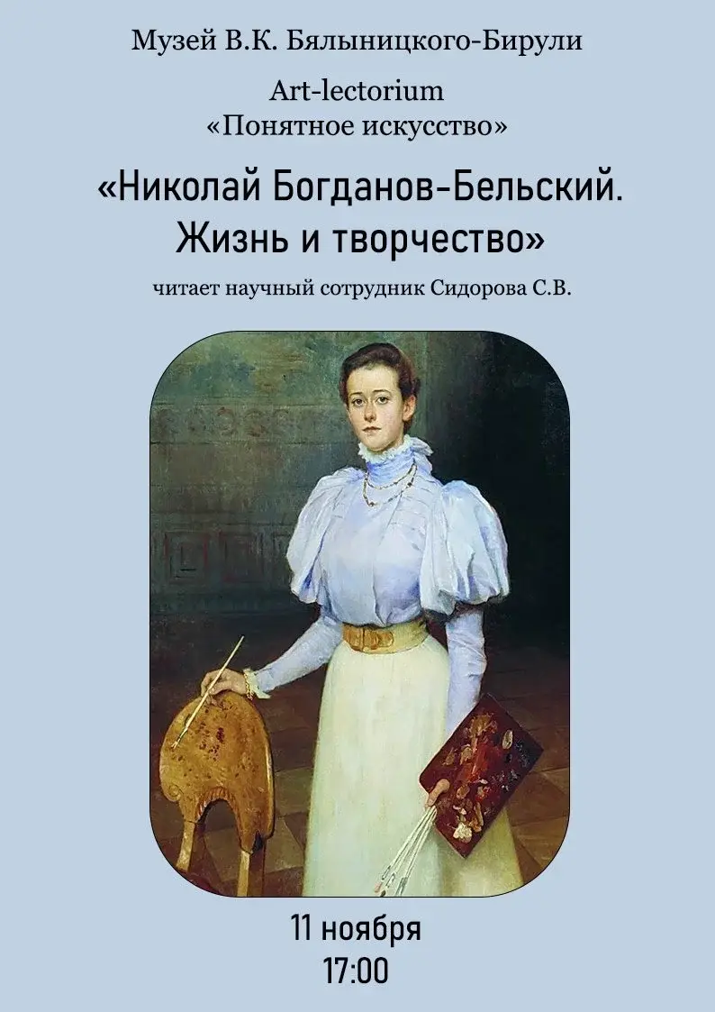 Лекция, посвященная творчеству Николая Богданова-Бельского, состоится в музее Бялыницкого-Бирули состоится 11 ноября. Начало в 17.00. Справки по телефону:80222-65-07-57.