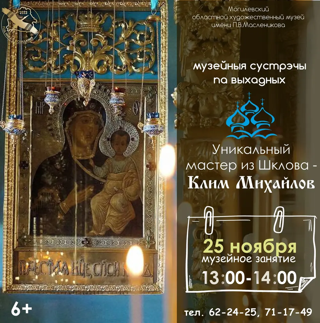 Встреча, посвященная творчеству мастера-резчика из Шклова, состоится в музее Павла Масленикова (улица Миронова, 33) 25 ноября. Начало – в 13.00. Цена билета – 5 рублей. Дополнительная информация по телефонам: 80222-62-24-25, 71-17-49.