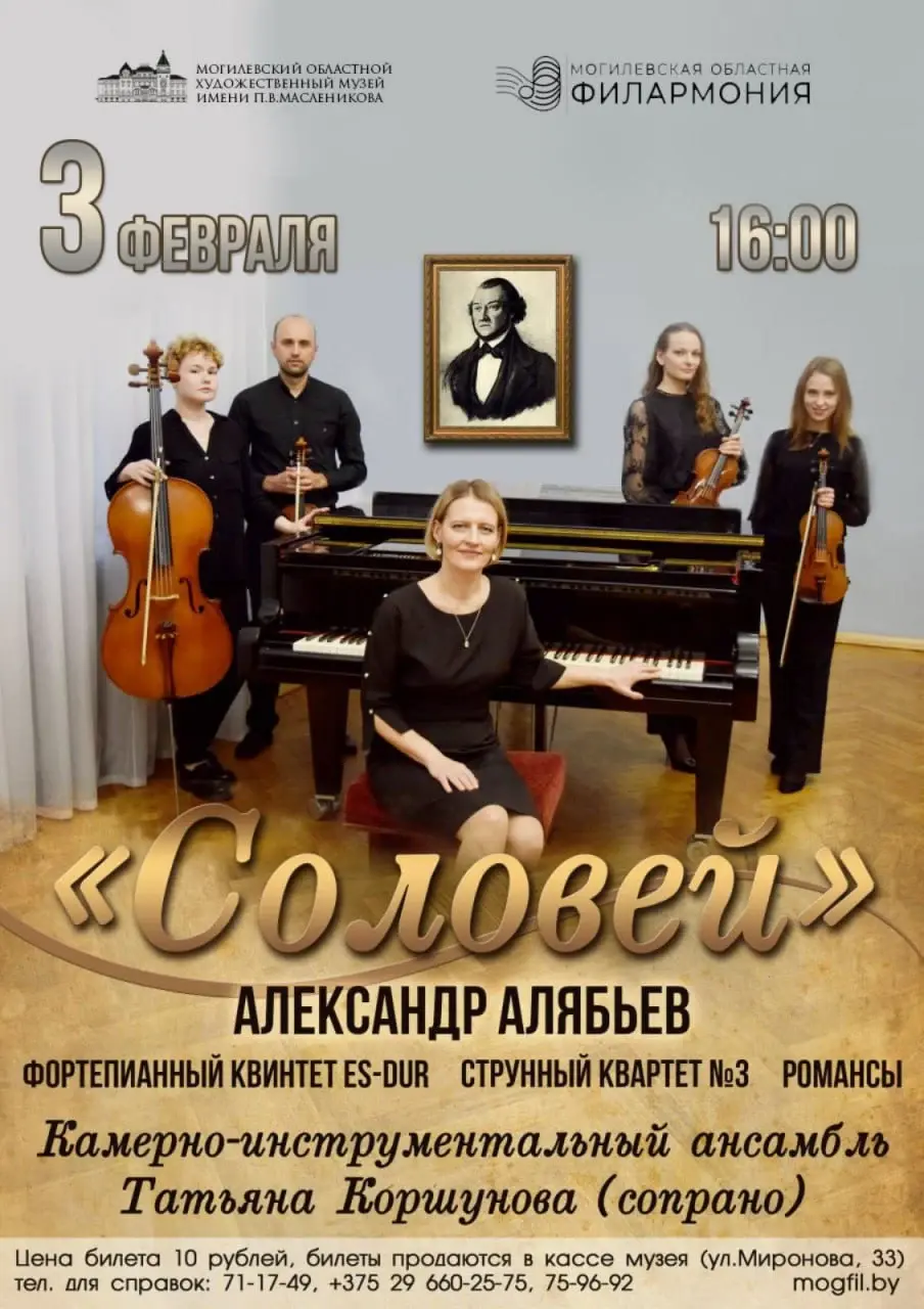 Концерт-лекцию под названием «Соловей» в стенах художественного музея имени Павла Масленикова представит камерно-инструментальный ансамбль Могилевской областной филармонии под руководством Виктора Гладкого. В концерте также примет участие Татьяна Коршунова – руководитель студии вокала Могилевской областной филармонии.