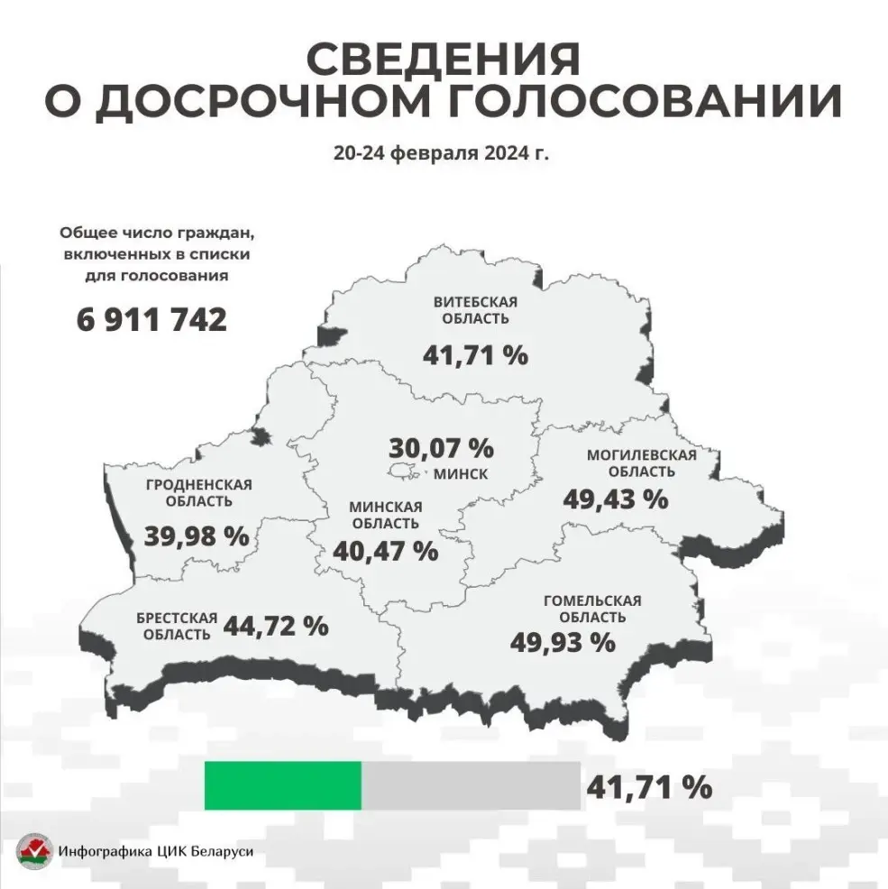 Досрочно на выборах депутатов проголосовали 41,71 % граждан, включенных в списки для голосования, сообщили в ЦИК Беларуси.