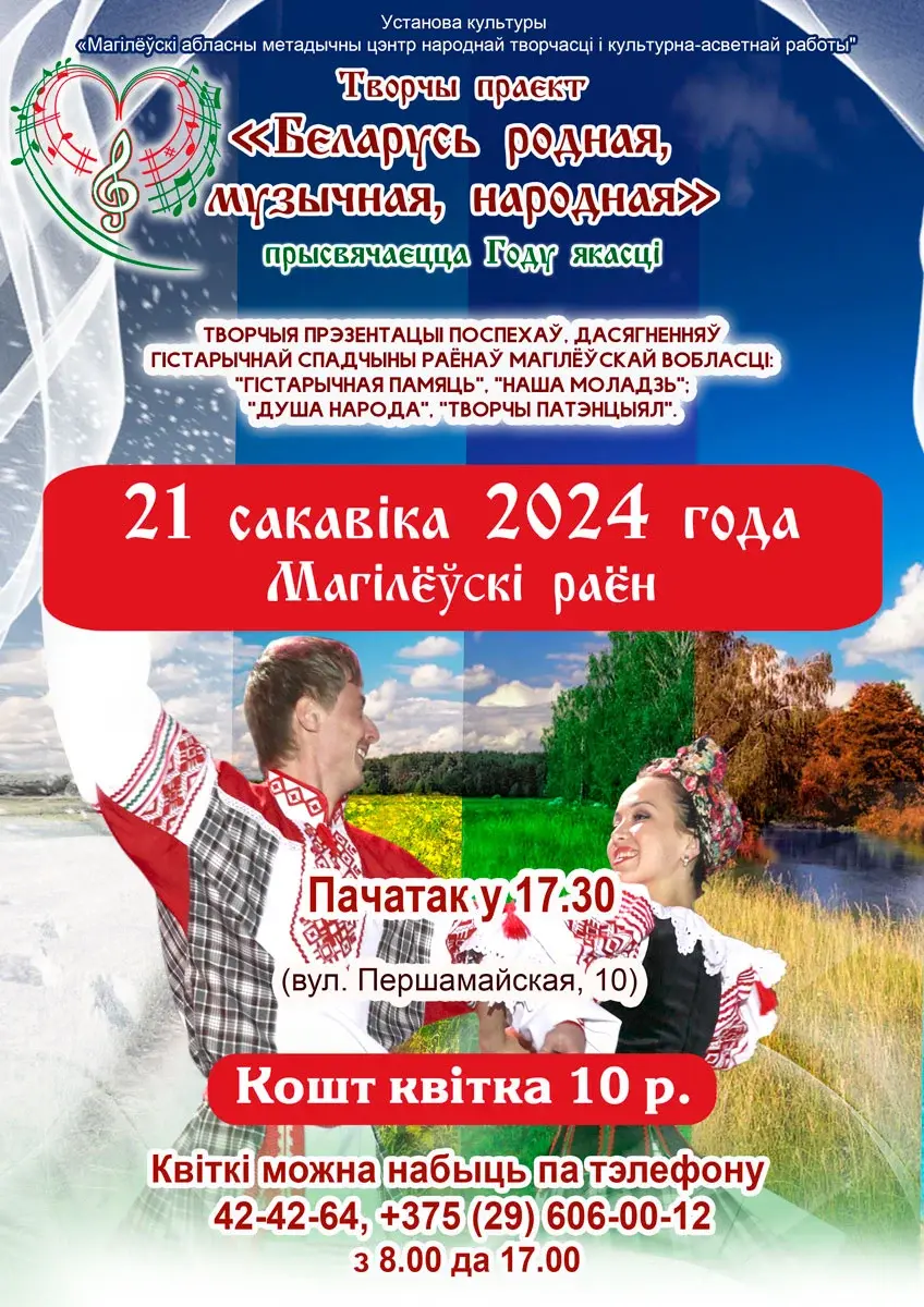 Творческая презентация Могилевского района состоится 21 марта в Центре народного творчества (улица Первомайская, 10). Начало в 17.30. Стоимость входного билета – 10 рублей. Справка по телефонам: 80222-42-42-64.