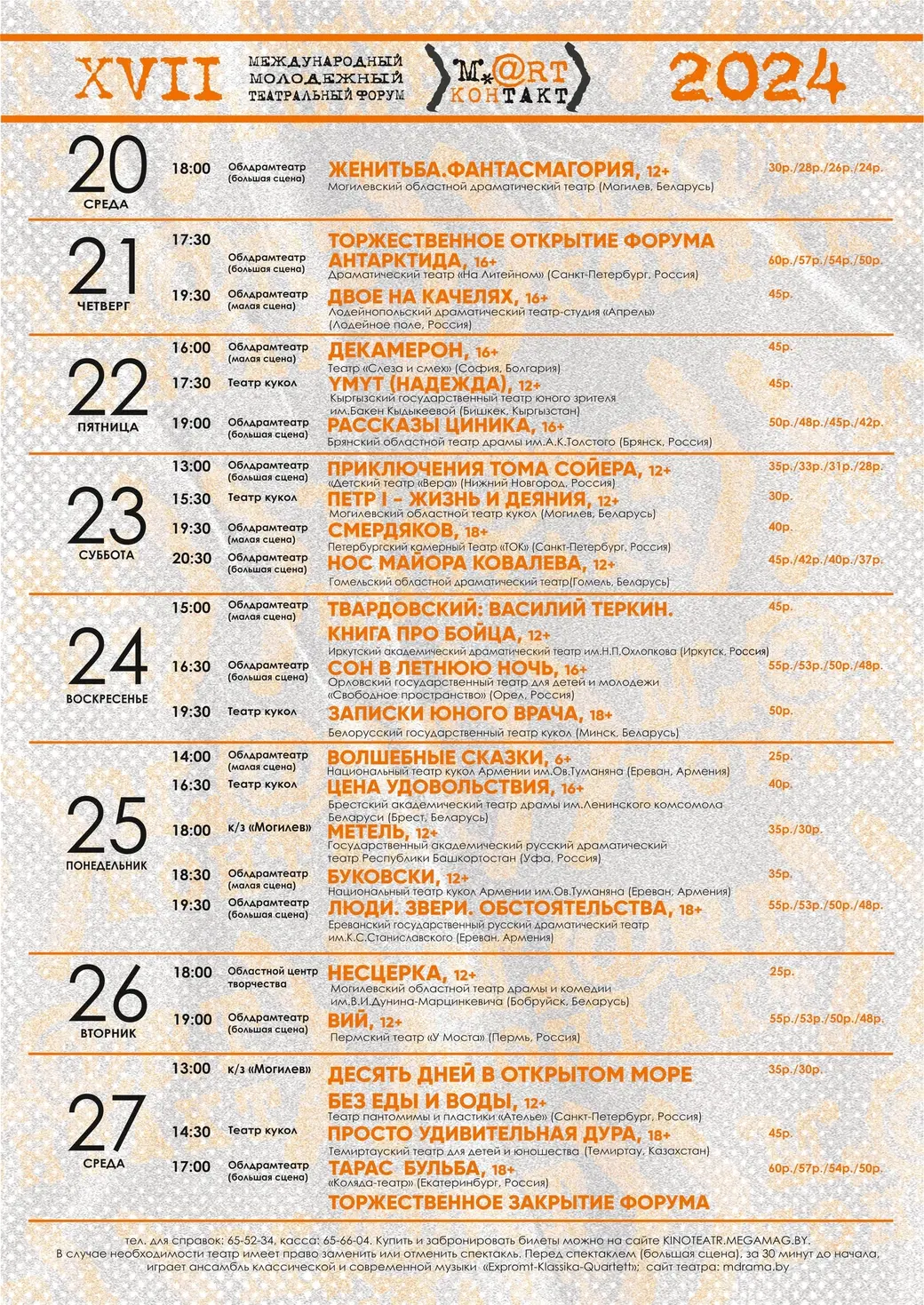 Театральный форум «М.@rt.контакт» проходит в Могилеве семнадцатый раз. В его программе заявлены спектакли 12 театров из Беларуси, России, Болгарии, Казахстана, Кыргызстана и Армении – всего 23 постановки.