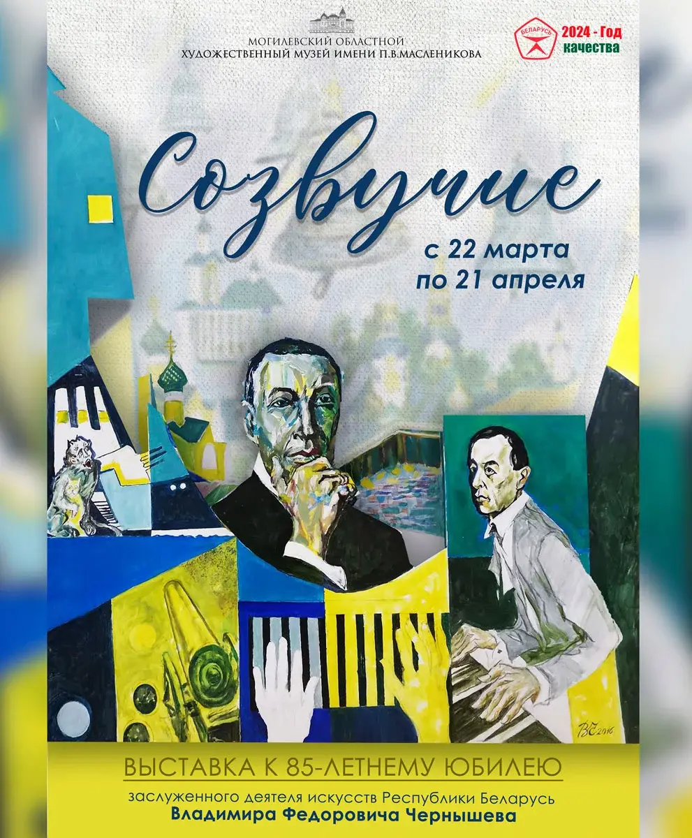 Выставочный проект «Созвучие» – пейзажи, представленные в живописи и в графике: яркие краски и динамика композиции позволят услышать картины художника Владимира Чернышева – Заслуженного деятеля искусств Республики Беларусь. Живописец и график окончил Пензенское художественное училище имени К. А. Савицкого и ВГИК (Москва). Переехал в Беларусь и много лет посвятил работе художника-постановщика на киностудии «Беларусьфильм» и в Национальном русском драматическом театре имени Горького.
